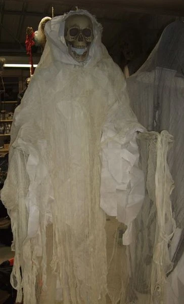 Suspension géante squelette de 2m de haut en tissu , plastique et intissé sur www.netbootic.com . pour une décoration de salles , à l’occasion de fêtes à thèmes ou de Halloween.