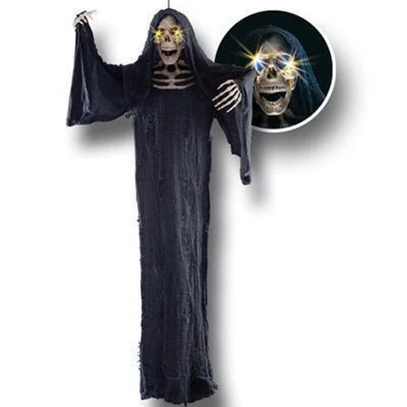 Suspension halloween de 160 cm de haut en tissu et plastique avec système lumineux dans les yeux (piles fournies) une façon originale de créer une ambiance d’horreur à donner froid dans le dos à l’occasion de fêtes sur le thème de l’épouvante ou à l’occasion d’halloween, de soirée pirate, médiévale