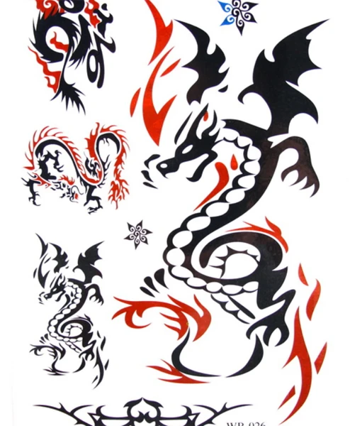 Assortiment de tatouages éphémères de différente tailles sur le thème dragons pouvant s’utiliser séparément ( Plaque de 34.3 cm X 12.1 cm ) . Faciles à appliquer et à enlever , waterproof , durent plusieurs jours . Utilisation du tatouage : après sélection de votre tatouage : 1) La peau doit être propre et exempt d’huile et le maquillage. 2) Retirez la feuille supérieure protectrice claire 3) Appuyez tatouage fermement sur la peau propre et sèche avec un design orienté vers le bas. 4) Maintenez chiffon humide contre le dos du tatouage, enfoncez-et veillez à le mouiller à fond. 5) Attendez 30 secondes (ne pas se presser). Décollez le papier protecteur. 6) Rincez doucement l’image avec de l’eau pour le meilleur effet. S’enlève à l’eau savonneuse ou démaquillant Attention: Ne pas appliquer sur la peau sensible, à proximité des yeux ou si vous êtes allergique à l’adhésif.
