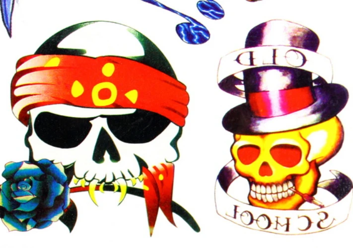 Assortiment de tatouages éphémères de différente tailles sur le thème squelettes pouvant s’utiliser séparément ( Plaque de 34.3 cm X 12.1 cm ) . Faciles à appliquer et à enlever , waterproof , durent plusieurs jours . Utilisation du tatouage : après sélection de votre tatouage : 1) La peau doit être propre et exempt d’huile et le maquillage. 2) Retirez la feuille supérieure protectrice claire 3) Appuyez tatouage fermement sur la peau propre et sèche avec un design orienté vers le bas. 4) Maintenez chiffon humide contre le dos du tatouage, enfoncez-et veillez à le mouiller à fond. 5) Attendez 30 secondes (ne pas se presser). Décollez le papier protecteur. 6) Rincez doucement l’image avec de l’eau pour le meilleur effet. S’enlève à l’eau savonneuse ou démaquillant Attention: Ne pas appliquer sur la peau sensible, à proximité des yeux ou si vous êtes allergique à l’adhésif.